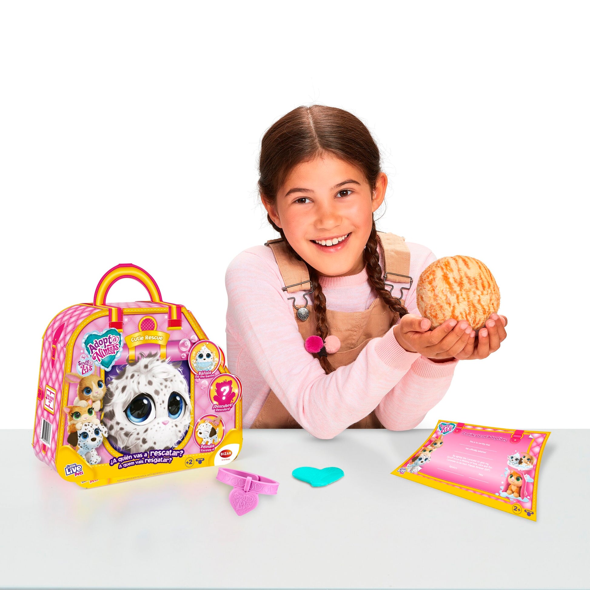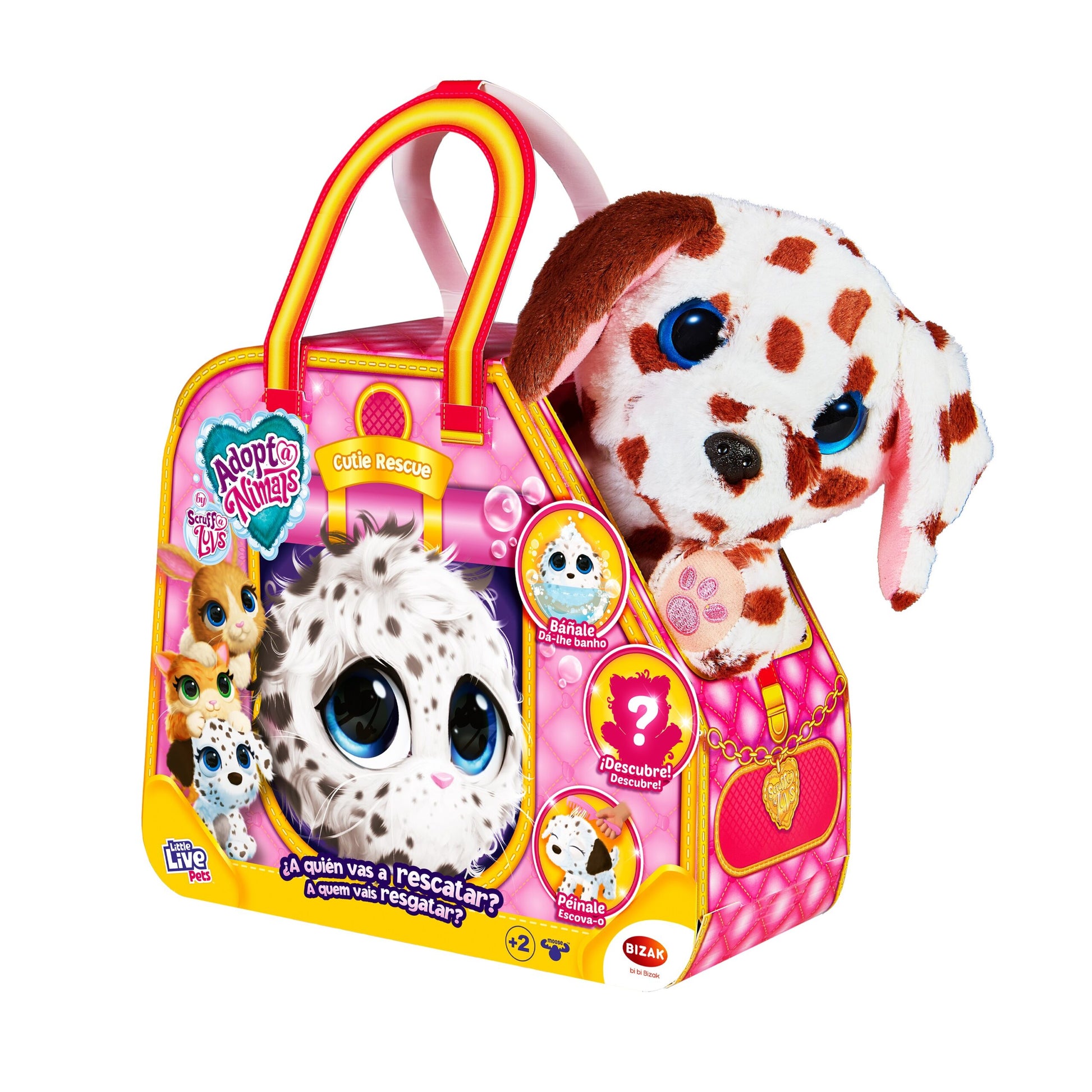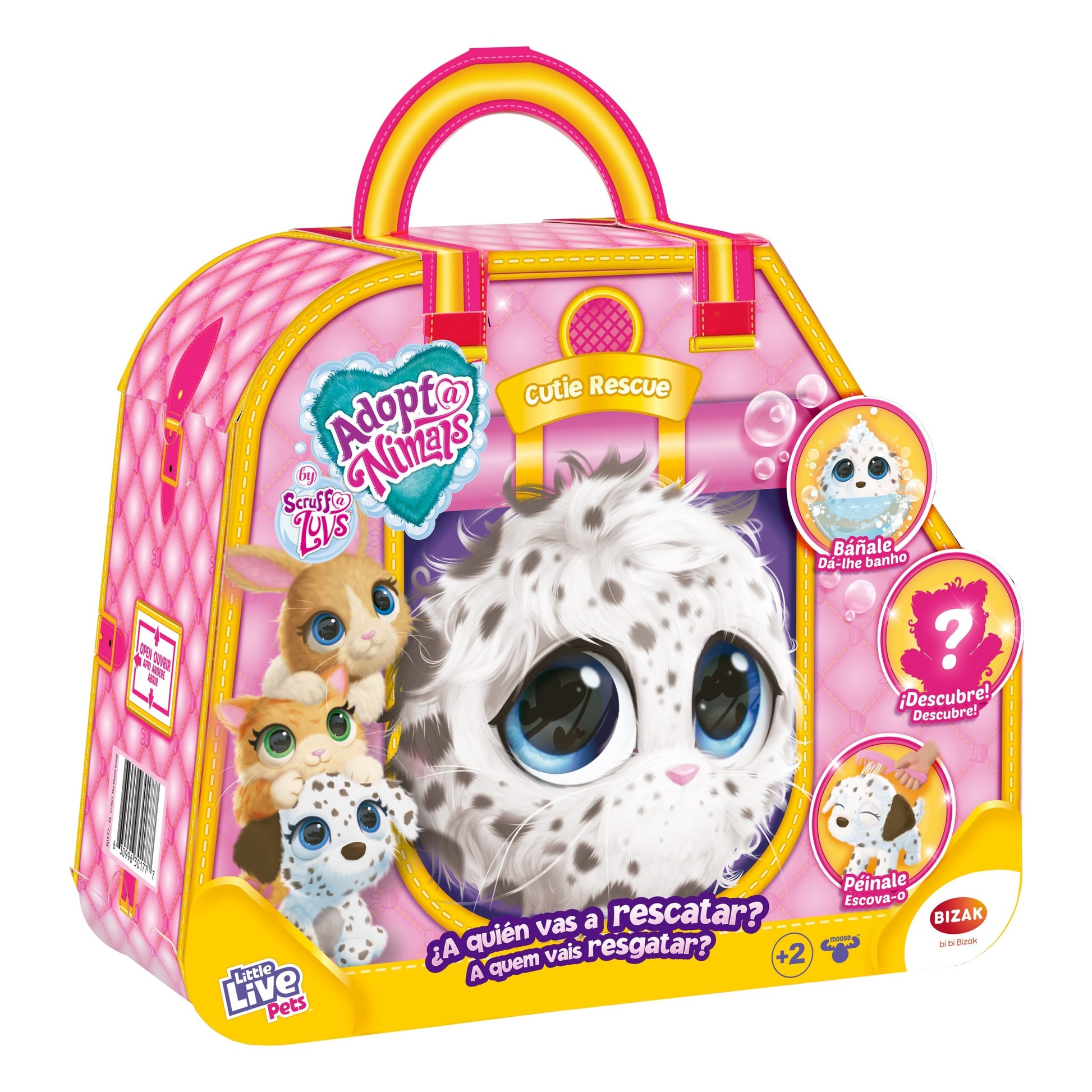 Adoptanimals - ¡Cuida a tu mascota! está lleno de sorpresas para los más pequeños. Rescata un animalito y dale un hogar para siempre. ¿Encontrarás un conejito, un cachorro o un gatito? Dentro encontrarás una bolita de pelo, pero en cuanto lo bañes, descubrirás una adorable mascota.