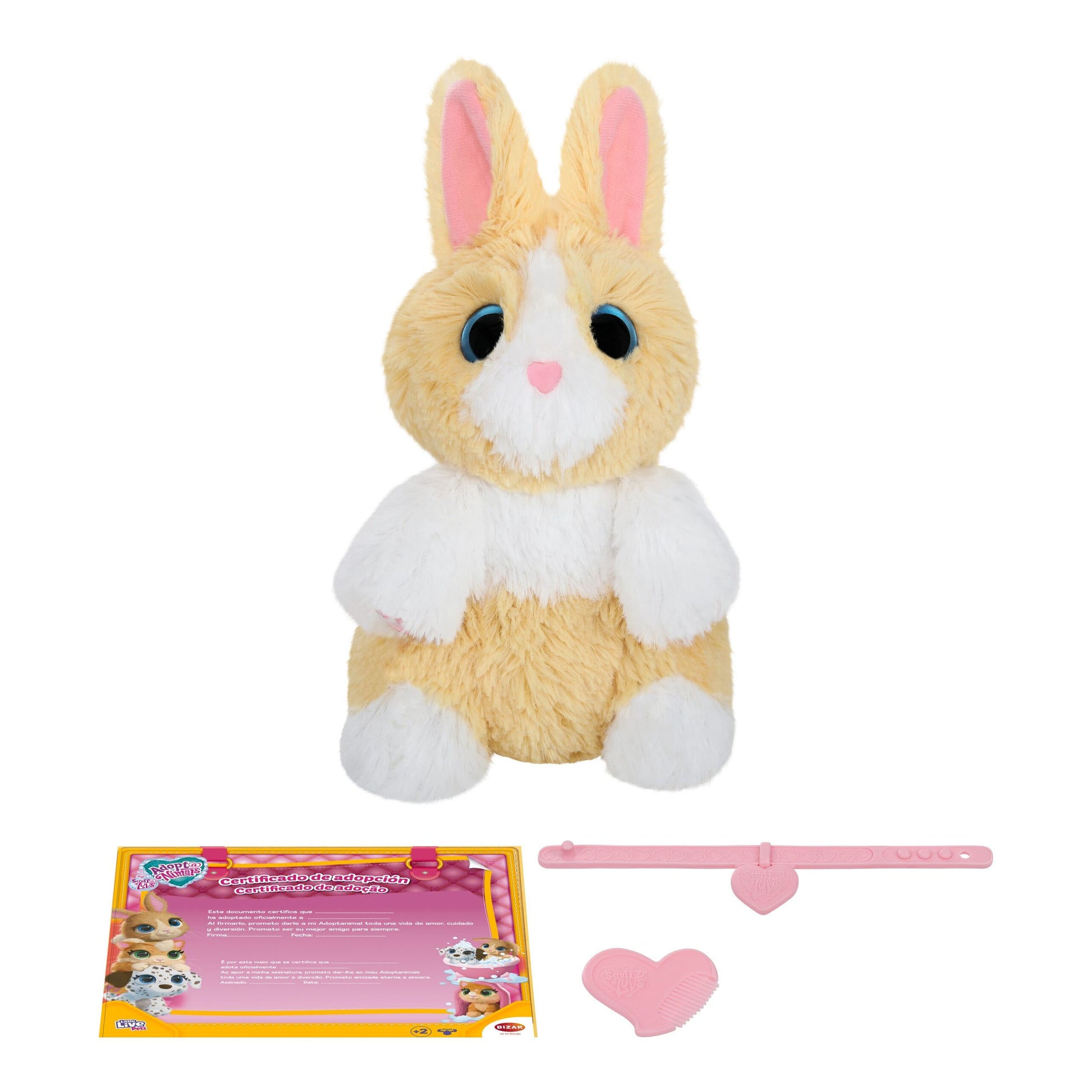 Lava, seca y cepilla con mucho cariño y cuidado, y usa todos los accesorios como el peine y el collar, junto con un certificado de adopción para que escribas tu nombre y lo hagas parte de tu familia para siempre. El envío es aleatorio. No es posible identificar el peluche incluido a través del embalaje exterior.