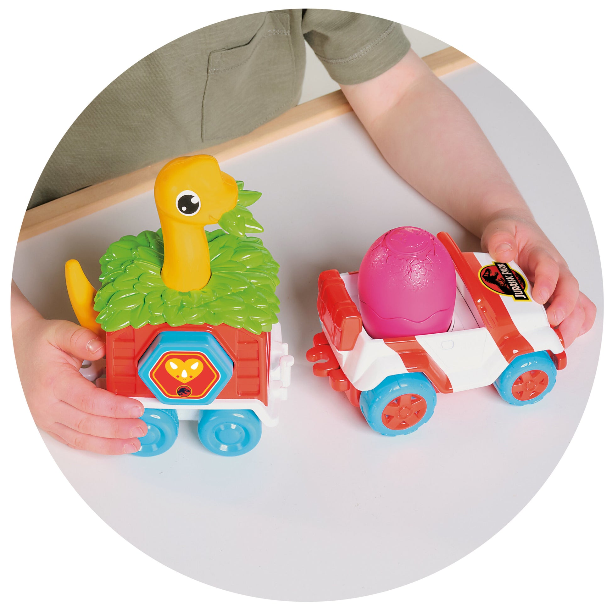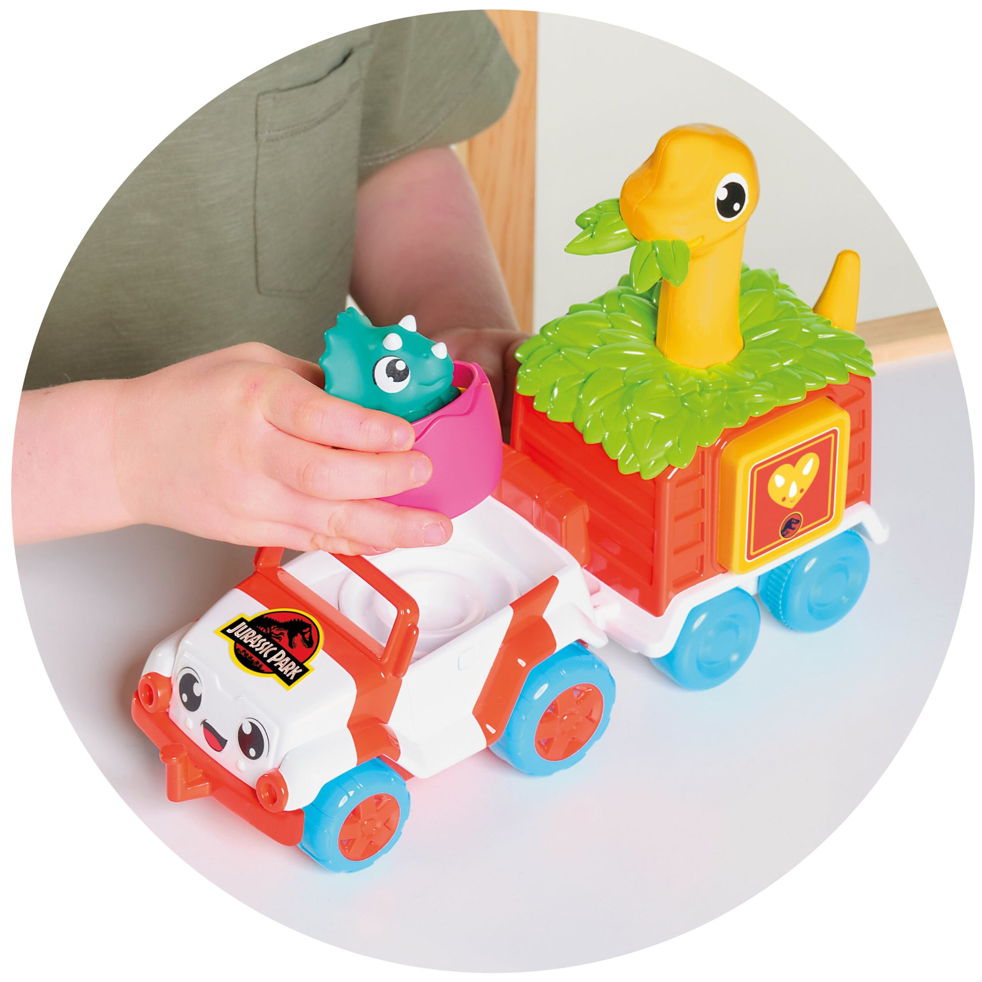 Un juguete fantástico inspirado no solo en el mundo de los dinosaurios, sino también en una de las licencias más conocidas y populares: Jurassic World. Coloca al dinosaurio bebé en el asiento del conductor del vehículo de rescate forestal y acopla el remolque; al presionar la cabeza de la madre dinosaurio, el conjunto comenzará a avanzar y la cabeza del dinosaurio bebé girará continuamente.