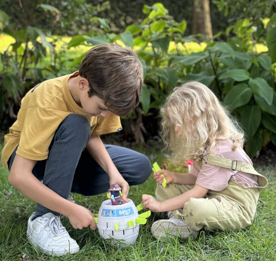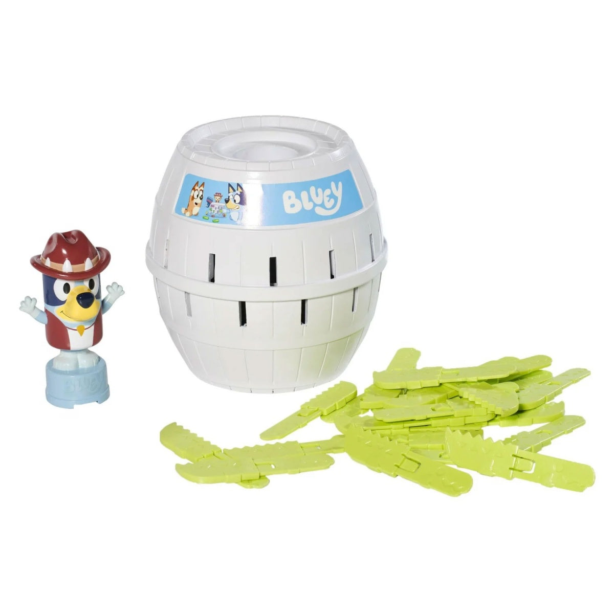 ¡Prepárate para la acción con este juego de mesa inspirado en una de las licencias preescolares más populares! Adaptado del clásico "Pirate Jump", ahora puedes unirte a la diversión con Bluey y sus amigos. Ideal para 2 a 4 jugadores, el objetivo es clavar las espadas de cocodrilo en el barril hasta que Bluey explote. ¡Risas y emoción garantizadas en cada partida!